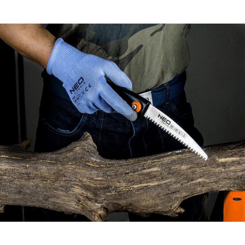 Piła ogrodowa 6″, 9 TPI – ostrze chowane NEO (nr ref. 42-100) przeznaczona jest do cięcia różnej wielkości kawałków drewna oraz gałęzi. Ostrze zostało wykonane ze stali manganowej, a jego długość wynosi 150 mm. Trójstronnie ostrzone i hartowane indukcyjnie zęby znacząco obniżają opory cięcia. Uzębienie 9 zębów na cal umożliwia zgrubne cięcie. W zestawie znajduje się pokrowiec na ostrze z tworzywa sztucznego, który można przypiąć do paska.