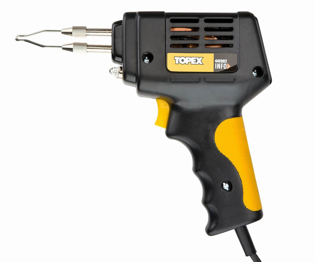 Lutownica transformatorowa TOPEX (nr ref. 44E002) o mocy 100W. Służy do łączenia metalowych części za pomocą niskotopliwego spoiwa np. cynowo-ołowiowego do lutowania miękkiego. Jest szczególnie przydatna przy łączeniu elementów o większym przekroju np. elektryczne instalacje samochodowe, elektryczne instalacje domowe niskiego napięcia oraz przy innych pracach wymagających zwiekszonej temperatury nagrzewania. Posiada wbudowaną żarówkę podświetlającą miejsce lutowania co znacznie podnosi komfort pracy. Zgodność z europejskimi standardami bezpieczeństwa zapewnia certyfikat CE. Marka TOPEX skierowana jest do majsterkowiczów.